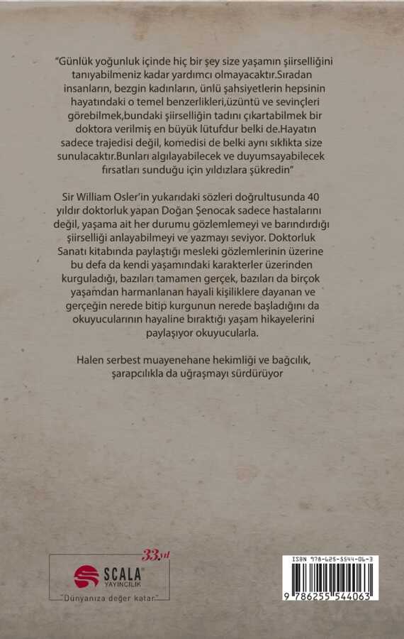 Sir William Osler’in yukarıdaki sözleri doğrultusunda 40 yıldır doktorluk yapan Doğan Şenocak sadece hastalarını değil, yaşama ait her durumu gözlemlemeyi ve barındırdığı şiirselliği anlayabilmeyi ve yazmayı seviyor. Doktorluk Sanatı kitabında paylaştığı mesleki gözlemlerinin üzerine bu defa da kendi yaşamındaki karakterler üzerinden kurguladığı, bazıları tamamen gerçek, bazıları da birçok yaşamdan harmanlanan hayali kişiliklere dayanan ve gerçeğin nerede bitip kurgunun nerede başladığını da okuyucularının hayaline bıraktığı yaşam hikayelerini paylaşıyor okuyucularla.