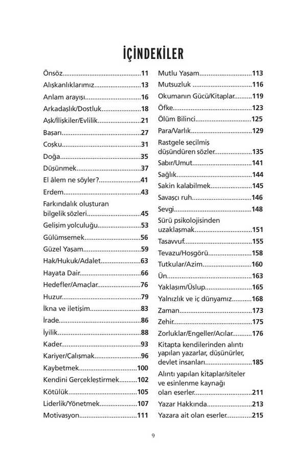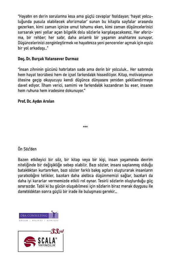 "Hayatın en derin sorularına kısa ama güçlü cevaplar fısıldayan; 'hayat yolculuğunda pusula olabilecek aforizmalar' sunan bu kitapta sayfalar arasında gezerken, kimi zaman içinize umut tohumu eken, kimi zaman düşüncelerinizi sarsarak yeni yollar açan bilgelik dolu sözlerle karşılaşacaksınız. Her aforizma bir rehber; her satır, daha anlamlı bir yaşamın anahtarını sunuyor. Düşüncelerinizi zenginleştirmek ve hayatınıza yeni pencereler açmak için eşsiz bir yol arkadaşı...'