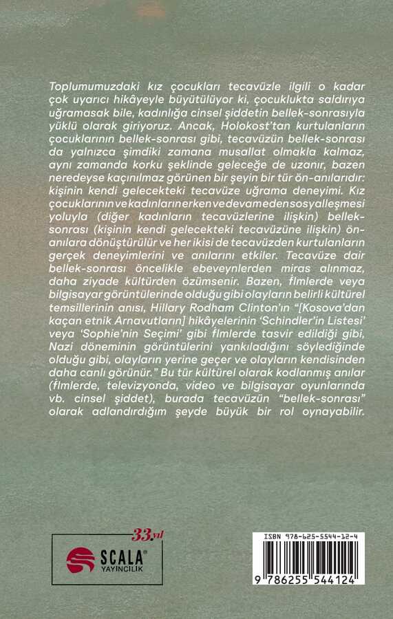 Toplumumuzdaki kız çocukları tecavüzle ilgili o kadar çok uyarıcı hikâyeyle büyütülüyor ki, çocuklukta saldırıya uğramasak bile, kadınlığa cinsel şiddetin bellek-sonrasıyla yüklü olarak giriyoruz. Ancak, Holokost’tan kurtulanların çocuklarının bellek-sonrası gibi, tecavüzün bellek-sonrası da yalnızca şimdiki zamana musallat olmakla kalmaz, aynı zamanda korku şeklinde geleceğe de uzanır, bazen neredeyse kaçınılmaz görünen bir şeyin bir tür ön-anılarıdır: kişinin kendi gelecekteki tecavüze uğrama deneyimi. Kız çocuklarının ve kadınların erken ve devam eden sosyalleşmesi yoluyla (diğer kadınların tecavüzlerine ilişkin) bellek sonrası (kişinin kendi gelecekteki tecavüzüne ilişkin) ön anılara dönüştürülür ve her ikisi de tecavüzden kurtulanların gerçek deneyimlerini ve anılarını etkiler. Tecavüze dair bellek-sonrası öncelikle ebeveynlerden miras alınmaz, daha ziyade kültürden özümsenir. Bazen, filmlerde veya bilgisayar görüntülerinde olduğu gibi olayların belirli kültürel temsillerinin anısı, Hillary Rodham Clinton’ın “[Kosova’dan kaçan etnik Arnavutların] hikâyelerinin ‘Schindler’in Listesi’ veya ‘Sophie’nin Seçimi’ gibi filmlerde tasvir edildiği gibi, Nazi döneminin görüntülerini yankıladığını söylediğinde olduğu gibi, olayların yerine geçer ve olayların kendisinden daha canlı görünür.” Bu tür kültürel olarak kodlanmış anılar (filmlerde, televizyonda, video ve bilgisayar oyunlarında vb. cinsel şiddet), burada tecavüzün “bellek-sonrası” olarak adlandırdığım şeyde büyük bir rol oynayabilir.