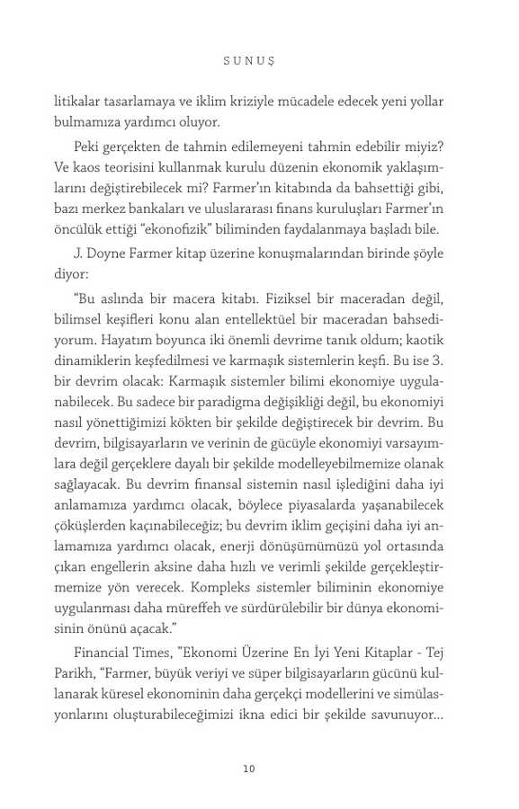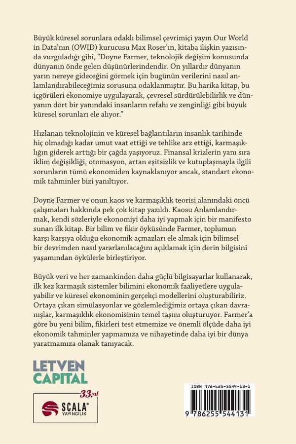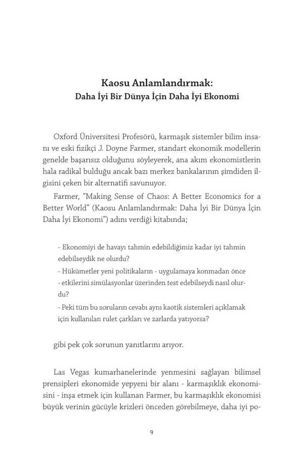 Hızlanan teknolojinin ve küresel bağlantıların insanlık tarihinde hiç olmadığı kadar umut vaat ettiği ve tehlike arz ettiği, karmaşıklığın giderek arttığı bir çağda yaşıyoruz. Finansal krizlerin yanı sıra iklim değişikliği, otomasyon, artan eşitsizlik ve kutuplaşmayla ilgili sorunların tümü ekonomiden kaynaklanıyor ancak, standart ekonomik tahminler bizi yanıltıyor.