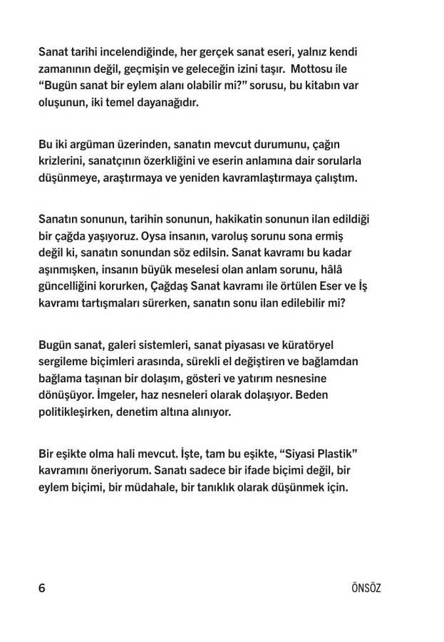 Bu kitapta yer alan yazılar, birbirinden bağımsız ama, birbirini tamamlayan metinler olarak, düşünsel ve sezgisel sürecin izini süren bir yaklaşımla dizildiler. Her bir yazı, kendi bağlamı içinde, bir meseleyi örneklerle tartışır. Birlikte okunduklarında, sanatın, bugün ne olabileceğine dair, eleştirel bir çerçeve sunar.
